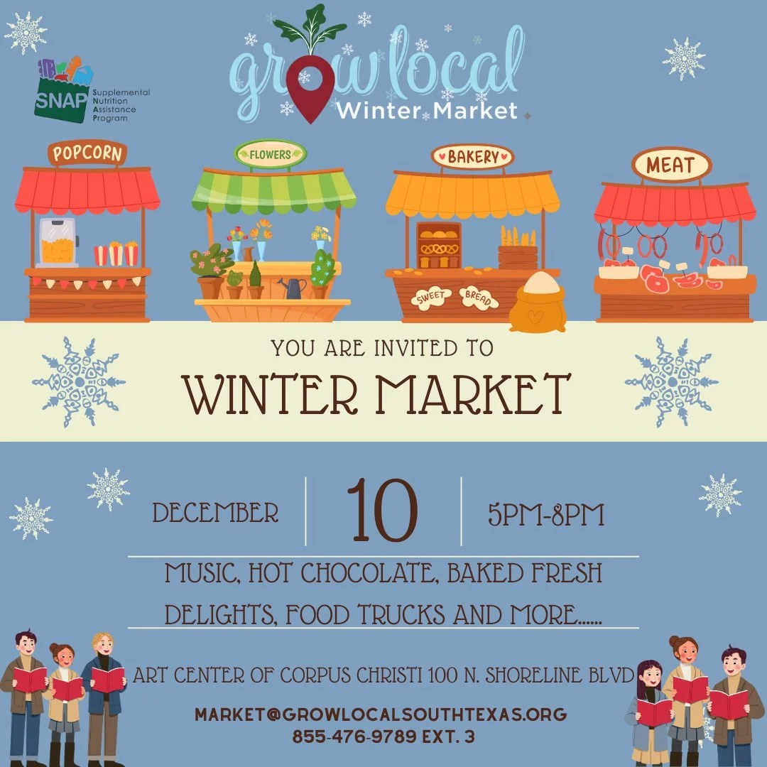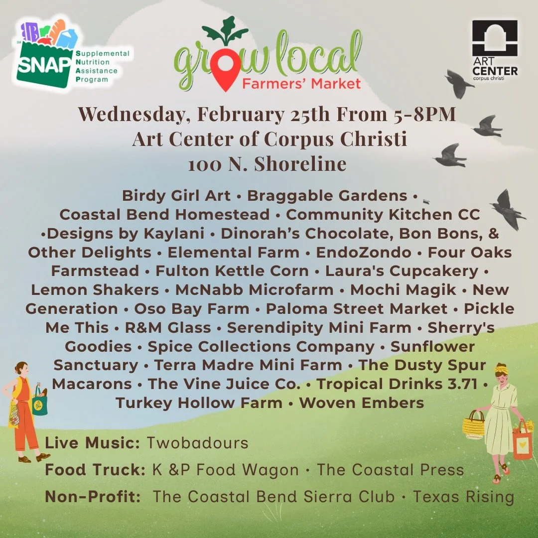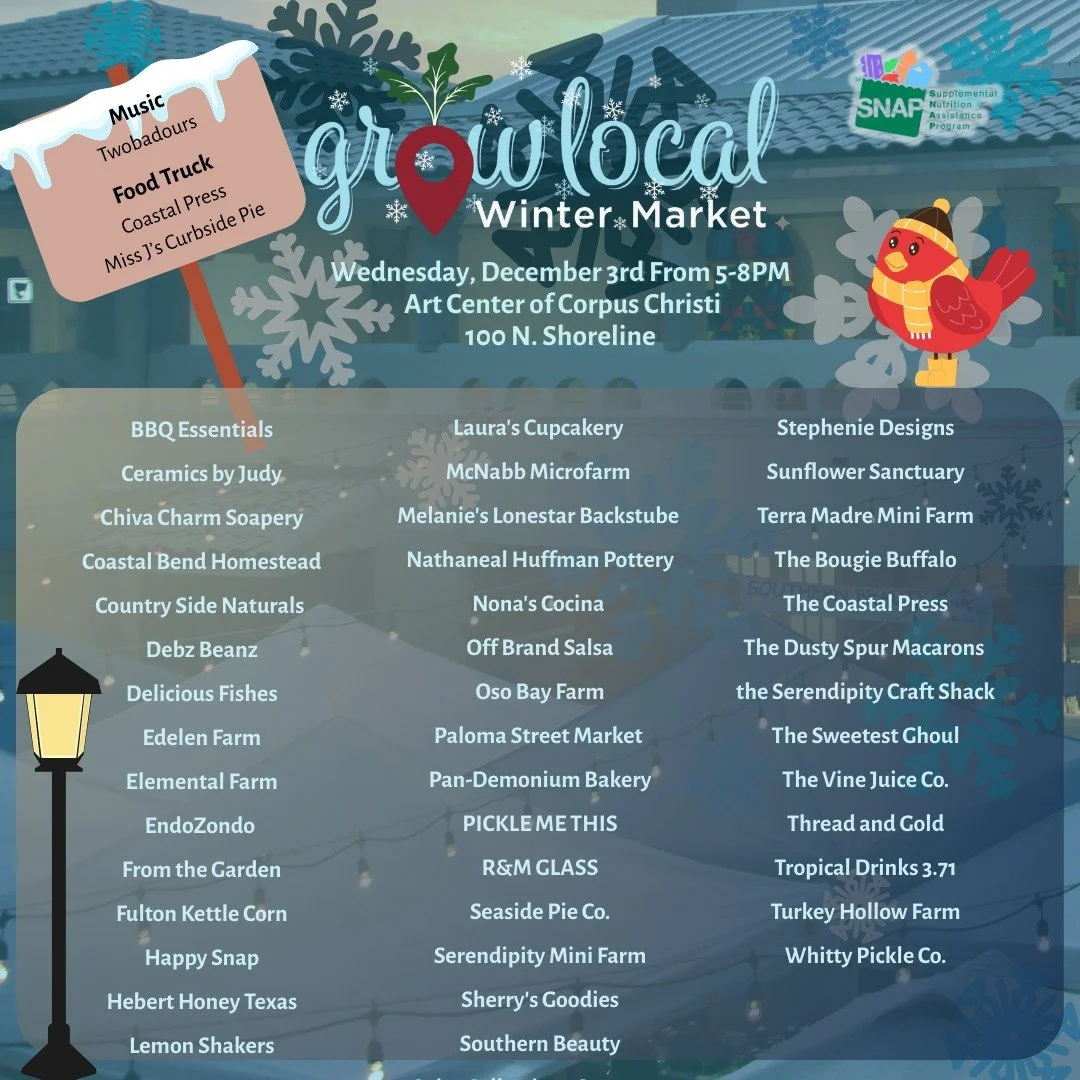 We are committed to maintaining a necessary point of food access in the Coastal Bend through the Grow Local Farmers’ Market, connecting local farmers with our community to provide food and essentials, as well as artisanal products from local businesses.