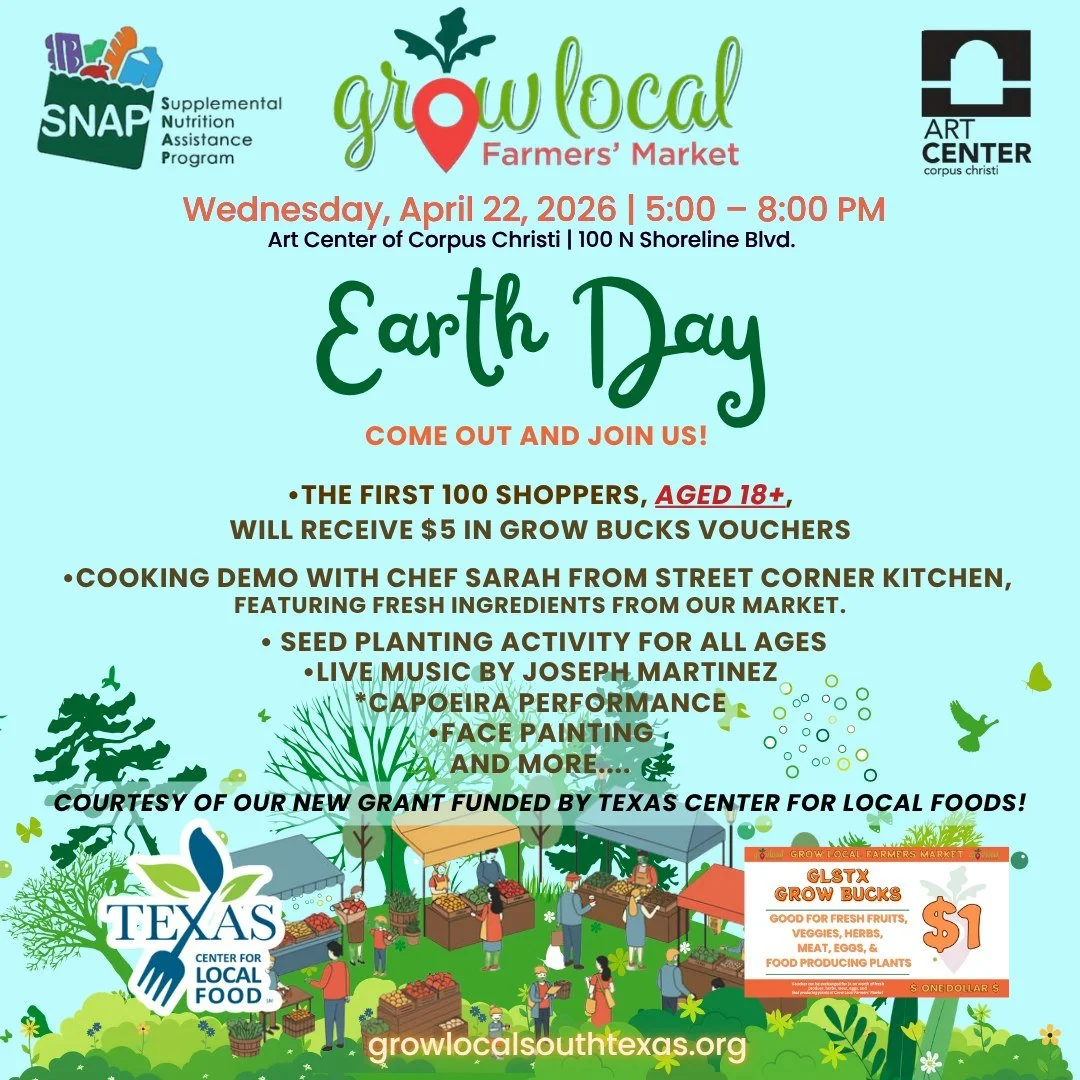 We are committed to maintaining a necessary point of food access in the Coastal Bend through the Grow Local Farmersโ Market, connecting local farmers with our community to provide food and essentials, as well as artisanal products from local businesses.